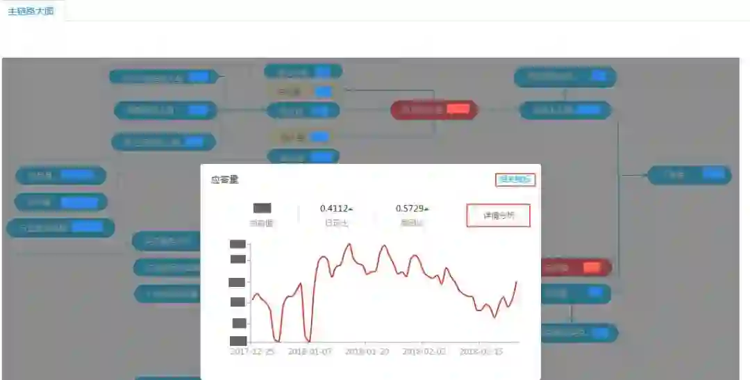 一个节点可以配置多个指标,主指标和相关指标。鼠标悬浮于节点可展示主指标及相关指标的趋势图,如果想进一步分析,可点击详情分析进入指标的下钻分析页面。