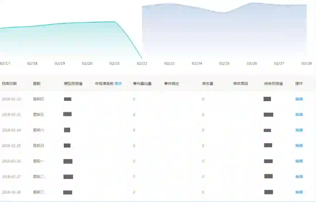 即可出现如下所示的话务量趋势图,并且可以根据自己掌握的信息对模型结果进行修正,修正后备注原因,便于模型的学习和调优,让后续预测结果更加精准。