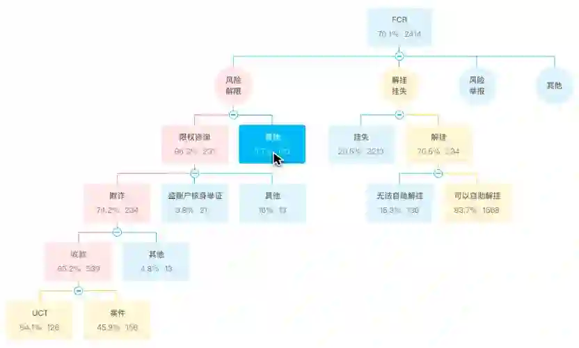 以服务线FCR(First Call Resolution,首次呼叫解决率,衡量客户服务及权益保障事业部解决客户问题能力的重要指标,一般为24小时内未重复来访的服务量占比)这个指标为例,通过下图所示的树状结构梳理安全服务线的服务量和FCR,拆解成一级业务,二级业务,三级业务的服务量和FCR的波动对整体FCR波动的贡献度,找出导致FCR波动的最主要的业务。如本例中限权咨询业务对当日FCR下降的贡献度为96.3%,运营同学应该着重关注该业务。