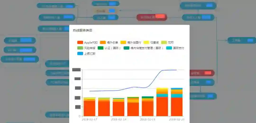 服务线要了解自己的服务做得好不好,首先是需要看描述性的数据,过去我们是靠一张张报表实现这种描述功能的。但是单个的KPI报表是散的,比如我们分别看了一条服务线服务流程各个点上的数据报表,并不能直观的拼成一条链路图来了解整个业务流程的运营情况。基于此,我们开发了可定制化的业务数据流程图和异常高亮及预警功能,让用户能对业务现状一目了然,实现了从“点”延伸到“线面体”。