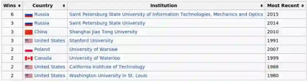 以上是ACM竞赛冠军次数最多的大学,第一名是俄罗斯的圣彼得堡国立信息技术机械与光学大学,简称 圣光机大学(ITMO),该校多年来一直压制着美国的斯坦福大学和加州理工大学。