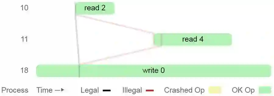 图中显示了三个进程(10,11,18)并发执行读取到2,读取到4和写入0的操作记录。从左到右为时间线,操作方框的左侧表示操作的开始时间,右侧表示结束时间,操作实际生效的时间可能在开始时间和结束时间之间的任意时刻。进程10读取到的值为2,该读取可以在进程18写入0的之前或之后,在进程11执行读取的时间段内,数据的值可能为0或者2,但不管数据的值为0还是2,都不允许进程11读取到4,因此不满足可线性化。