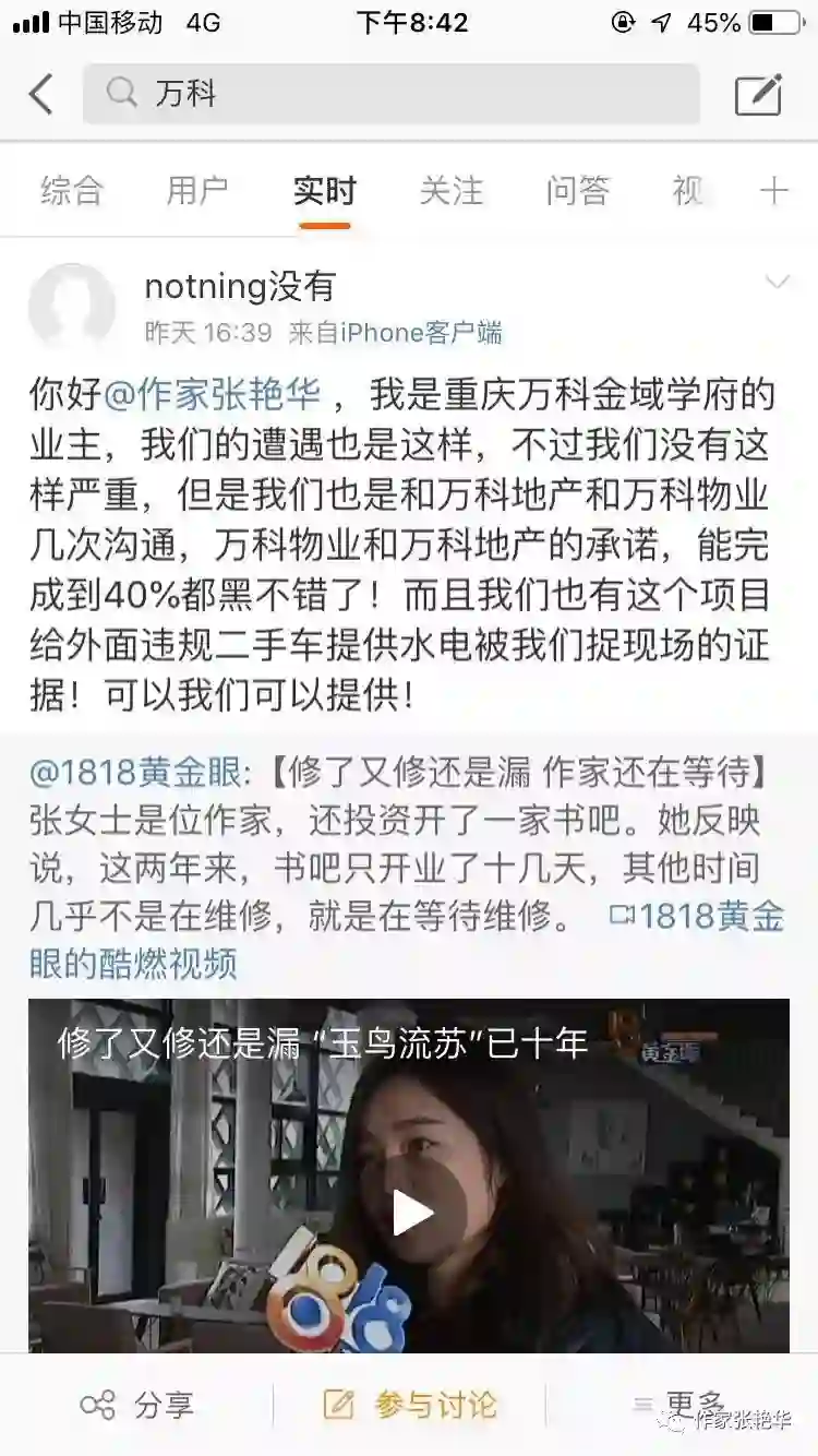 我们这些文人墨客原本没工夫关心企业的事,也无意笔伐谁,但贵公司杭州地区管理上的无作为、强势、欺瞒,逼的我毫无退路。我本对书香生活心存向往,从企业高管职位辞职后,在杭州良渚文化村开设一家700平米的书吧,但这家书吧自从2016年10月装修好到现在一直未正常营业。几百万投资款、装修款、时间和精力都打了水漂。为什么?因为你们万科严重的豆腐渣工程,房子修了两年都没修好!!