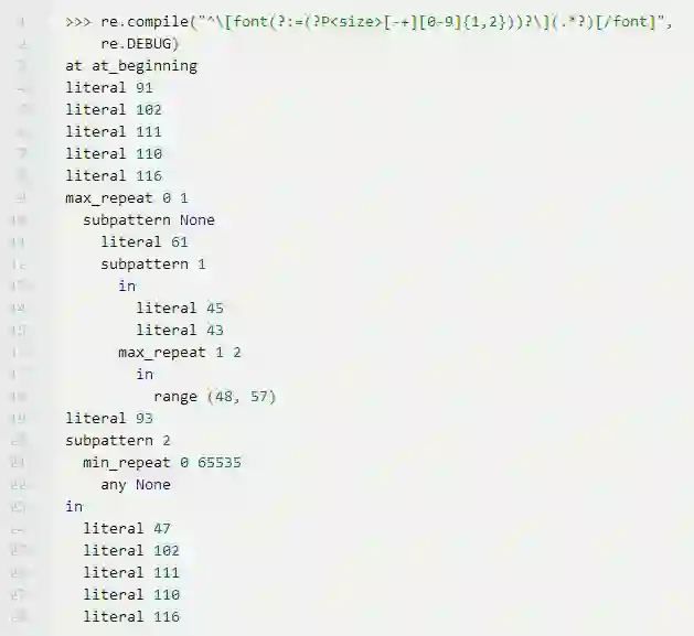 正则表达式是Python的一大特色,但是调试起来会很痛苦,很容易得出一个bug。幸运的是,Python可以打印出正则表达式的解析树,通过re.debug来显示re.compile的完整过程。