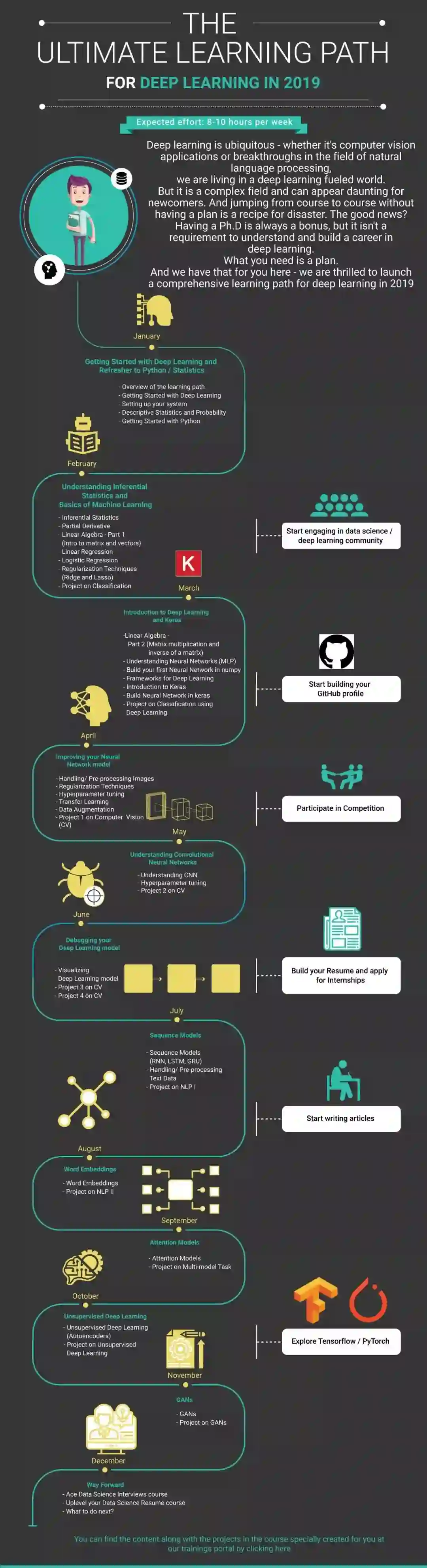 入门:深度学习是由几个专业组成的广阔领域。因此,为了开始您的学习之旅,建议您从头开始。第一个月将全面了解深度学习的含义,涵盖基本的数学、描述性统计和概率概念,以及学习Python!