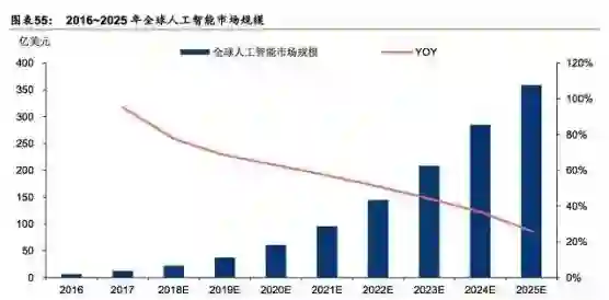 2016~2025年全球人工智能市场规模复合增速或达50.7%。据Statista估计2017年人工智能市场规模约12.5亿美元,增速约达95%;到2025年市场规模或将达369亿美元。