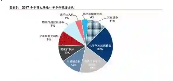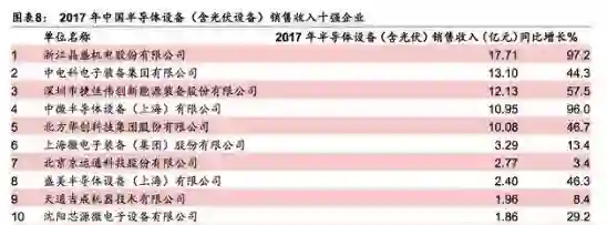 据SEMI统计,2017年中国大陆半导体设备销售额为82.3亿美元,据中国电子专用设备工业协会数据,2017年中国国产半导体设备(不含光伏设备)48.07亿元,据此计算中国半导体设备市场国产化率仅为9%。