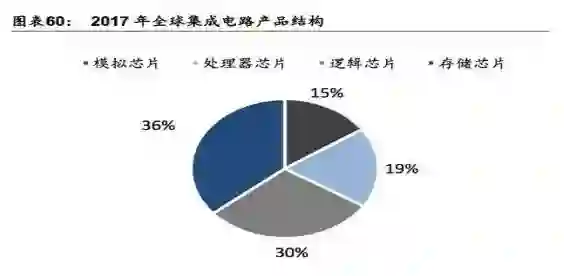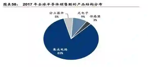 2017年全球半导体市场中集成电路销售额约占83%,集成电路销售额同比增长24%,位居半导体细分产品中增速最高的板块。