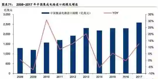 2017年,集成电路产品进口金额达到2588亿美元,已经替代原油成为我国第一大进口商品。
