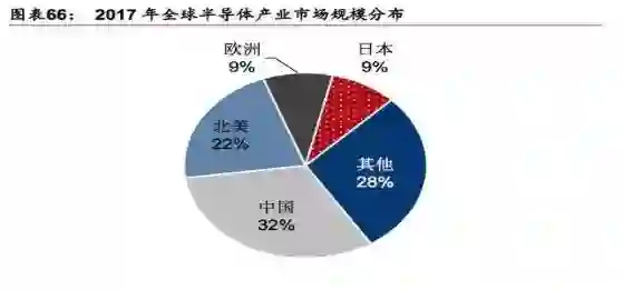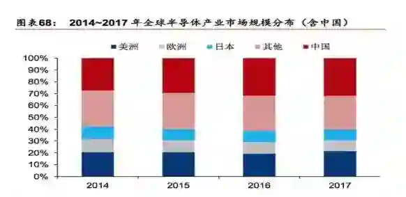 过去二十年全球半导体市场消费格局不断变迁,以中国市场为核心的亚太地区(除日本)2017年占比已达60%,中国占比32%。