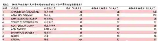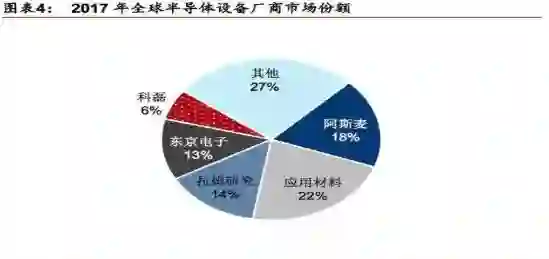据Bloomberg数据,2017年全球五大半导体设备制造商分别为应用材料(AMAT)、阿斯麦(ASML)、拉姆研究(LamResearch)、东晶电子(TLE)、科磊(KLA),这五大半导体制造商在2017年以其领先的技术、强大的资金支持占据着全球半导体设备制造业超过70%的份额。
