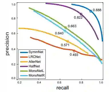 为了验证模型设计的有效性,我们在 SceneFlow 数据集上测试了SymmNet 及其一些变体。在图2我们提供了示例结果,并在图4中可视化 PR 曲线结果。