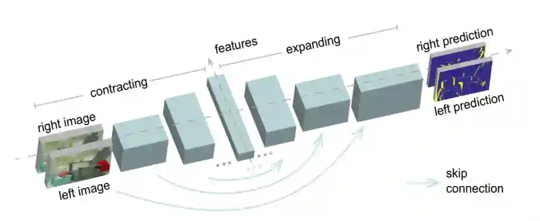 我们提出了一种对称结构的卷积神经网络 (SymmNet),通过左右对称结构来预测堆叠双目图像流的遮挡问题。下图1说明了我们所提出的网络的简要架构,我们遵循 FlowNet 的结构来构建一个完整的卷积网络,其中包含一个收缩部分 (contractive) 和扩展部分 (expanding),以跳跃连接的方式连接这两部分。