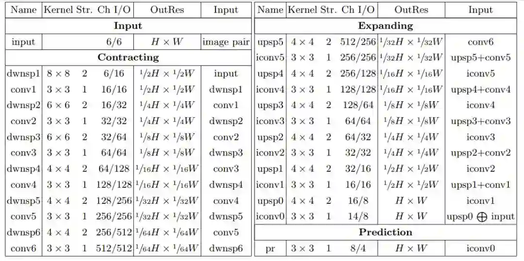 与 FlowNet 结构不同,我们的 SymmNet 模型采取了几种网络修剪策略以提高网络的计算效率。首先,我们对特征通道的数量进行压缩。第一层有16个过滤器。每次对特征映射图的空间大小进行下采样时,网络的特征长度都将翻倍,并在收缩模块的最后一层达到最大值,该层包含512个过滤器。然后,我们更换了跳跃连接中的连接方式,并相应地减小扩展模块的特征长度以匹配收缩模块。另一个修改是我们的网络在扩展模块后又包含一个额外上采样模块,以获得全分辨率的输出。由上采样到全分辨率,原始图像的特征将与最后一层的卷积层特征相连接。这是出于图像低层次特征可以帮助定位遮挡物的考虑而做的处理。