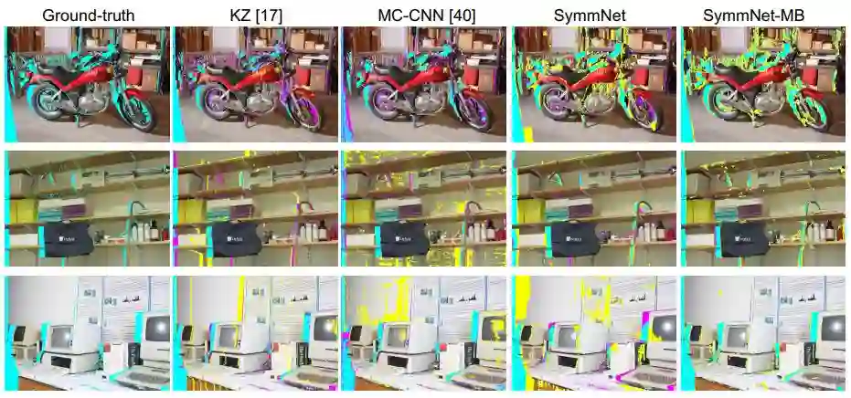 我们在 SceneFlow 和 Middlebury 数据集上验证 SymmNet 模型的整体性能,并其他两种检测器进行比较。定性结果及定量结果分别如下图4,图5及表2所示。