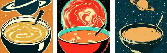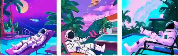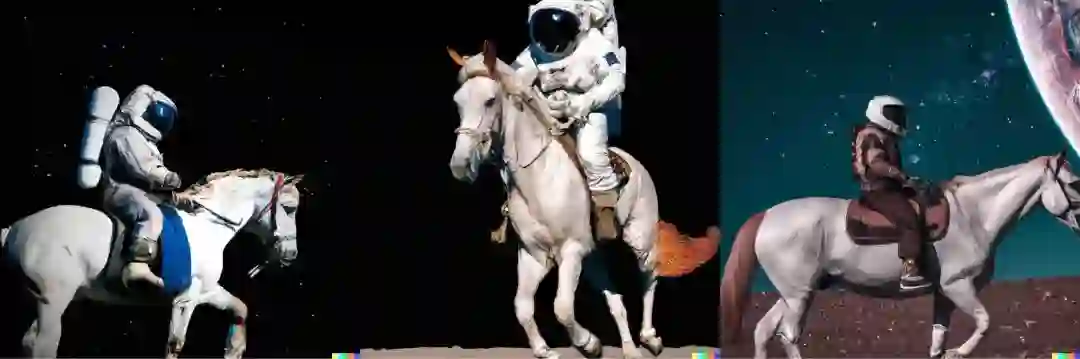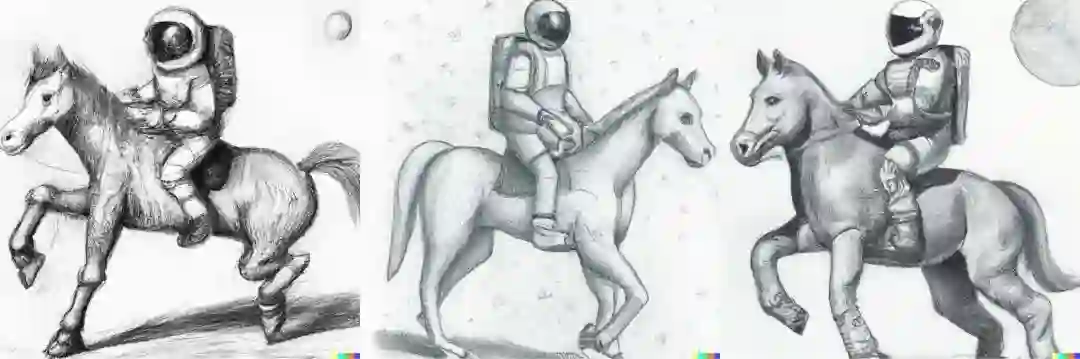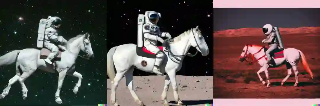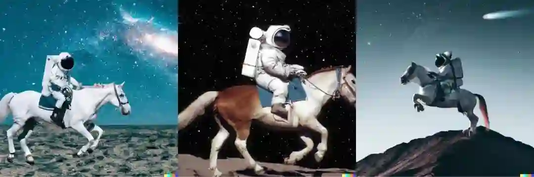 在满足三种给定元素的基础上,它可是充分发挥了自己的「想象力」,不仅马的姿态各不相同,而且给宇航员穿上了样式各异的服装,场景也是十分丰富,草地上、山顶上、星空中......