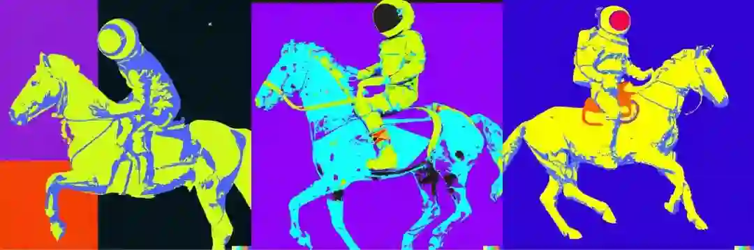 如果你想要变换文本中概念、属性和风格三个元素中的一个或多个,比如保留「概念」“一个宇航员”和「属性」“在骑一匹马”,而将超现实主义风格替换为波普艺术家安迪·沃霍尔的风格,DALL·E 2也可以「轻松」转换它的绘画风格: