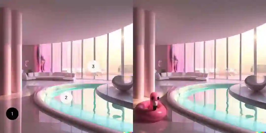 DALL·E 2 可以根据自然语言描述的标题对现有图像进行逼真的编辑,比如,在考虑阴影、反射和纹理的同时增加或删除图中的某个元素。示例如下: