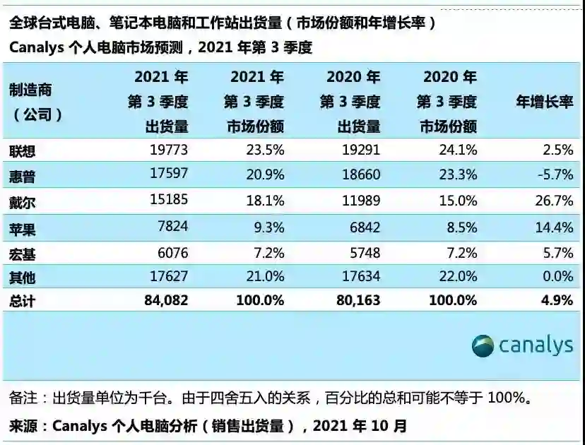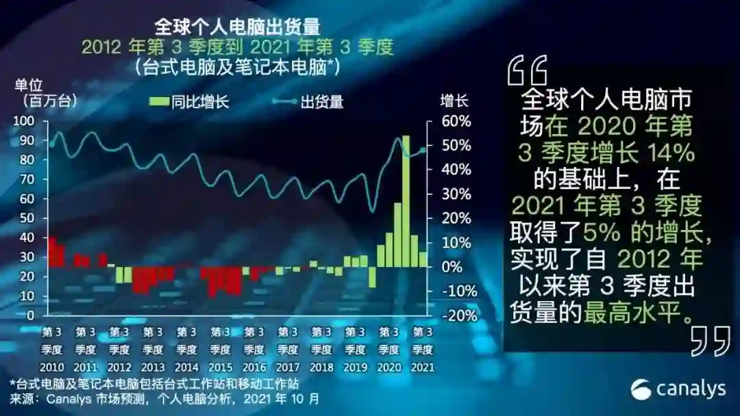 昨日 Canalys 发布最新分析报告,在五个季度实现两位数增长后,全球个人电脑市场在 2021 年第 3 季度的年增长率降至 5%,电脑出货量为 8410 万台。尽管增长有所放缓,但因为 20 年第 3 季度的强劲表现,销量仍保持在一个非常高的水平。从 2019 年第 3 季度开始到现在,全球个人电脑市场在这两年的复合年增长率为 9%。