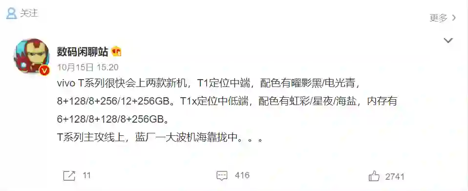 vivo T1 配色有曜影黑、电光青,有 8+128GB、8+256GB、12+256GB 三种配置版本;vivo T1x 配色有虹彩、星夜、海盐,配置为 6+128GB、8+128GB、8+256GB。vivo T 系列主攻线上,vivo 还将发布一大波新机。