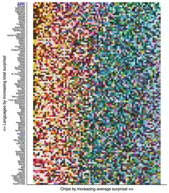 下图是对分析结果的直观展示。每一列按沟通效率从高到低的顺序由左至右排列了一种语言中的颜色。所有语言在这些色块上的排序都大致相似,暖色调靠左(更易沟通)、冷色调靠右(更难沟通)。图中纵坐标表示每种语言中常用色彩词汇的多少,顶端的语言(英语和西班牙语)中有更多常用色彩词汇。