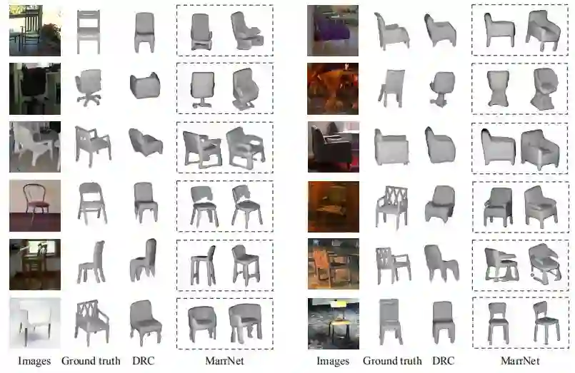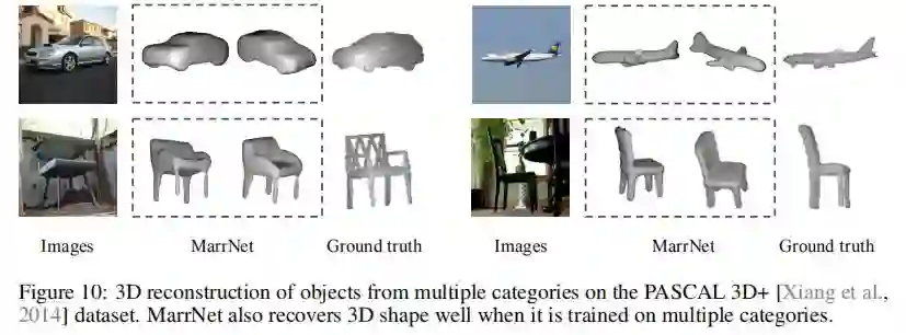 在这项工作中,我们提出了MarrNet,这是一种端到端的可训练模型,可以按顺序估算2.5D草图和3D物体形状。我们提出的方案分为两步,它有三个优点:首先,与完整的3D形状相比,2.5D草图更容易从2D图像中恢复;恢复2.5D草图的模型也更有可能从合成数据转移到实际数据。其次,对于2.5D草图的3D重建,系统可以纯粹从合成数据中学习。这是因为我们可以轻松渲染逼真的2.5D草图,而无需在真实图像中对物体的外观变化,包括光照,纹理等进行建模。这进一步缓解了域适应问题。第三,我们推导出从3D形状到2.5D草图的可微类投影函数;因此,框架可以在真实图像上进行端到端的训练,不需要人类注释。我们的模型在3D形状重建方面实现了最先进的性能。