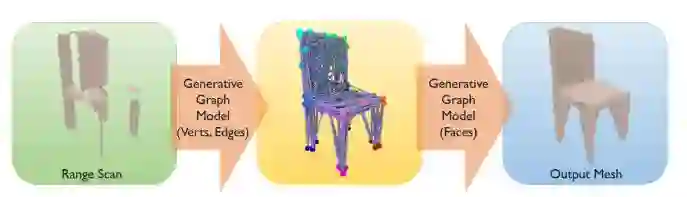 本文提出了Scan2Mesh,这是一种新颖的数据驱动的生成方法,它将非结构化和可能不完整的范围扫描转换为结构化的3D网格表示。这项工作的主要贡献:构建了一种输入是3D对象的范围扫描,其输出是以输入扫描为条件的索引面集的生成神经网络架构。为了生成3D网格作为一组顶点和面部索引,生成模型建立在顶点,边和面的一系列代理损失之上。在每个阶段,我们通过卷积和图形神经网络架构的组合,实现预测的和真实数据点之间的一对一离散映射。这使我们的算法能够预测紧凑的网格表示,类似于使用3D建模软件通过艺术家手工创建的网格表示。因此,我们生成的网格结果可生成更灵敏,更清晰的网格,其结构与通过隐式函数生成的网格具有根本不同的结构,这是缩小与艺术家创建的CAD模型的差距的第一步。