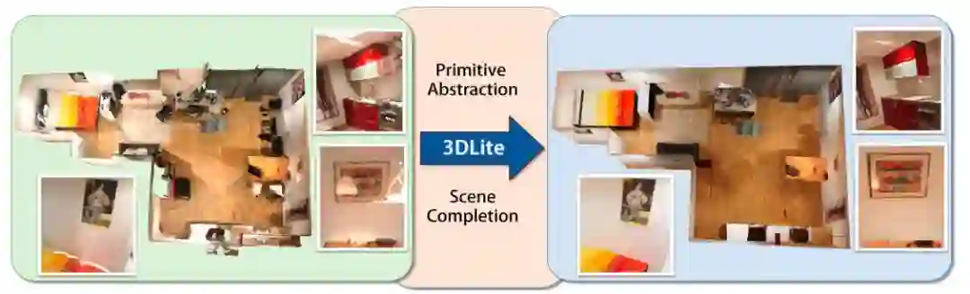 本文提出了3DLite,这是一种使用消费者的RGB-D传感器重建3D环境的新方法,它使我们朝着直接利用图像应用程序(如视频游戏、虚拟现实或AR)中捕获的3D内容迈出了一步。我们的方法不是重建真实世界的精确的一对一表示,而是计算出一个轻量、低多边形的扫描几何的几何抽象。我们认为,对于许多图形应用来说,获得高质量的表面纹理比获得高细节的几何图形更重要。为此,我们通过扭曲和缝合来自低质量RGB输入数据的图像片段来补偿运动模糊、自动曝光伪影和相机姿态中的微小错位,以实现高分辨率、锐利的表面纹理。除了观察到的场景区域外,我们外推场景几何体以及映射的表面纹理,以获得完整的环境3D模型。我们表明,场景几何图形的简单平面抽象非常适合此完成任务,使3DLite能够生成完整、轻量级且具有视觉吸引力的三维场景模型。我们认为,这些类似CAD的重建是在实际物体创建中利用RGB-D扫描的重要步骤。