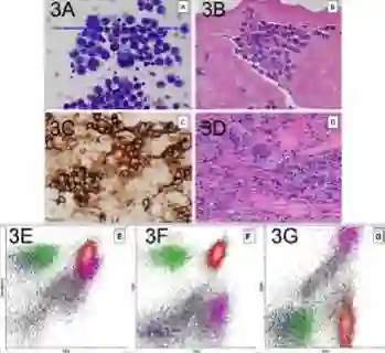 多数BIA-ALCL表现为假体周围渗液,因此FNA标本细胞学检查很有必要,至少需要10 ml渗液,50ml更理想,并提示病理医师注意BIA-ALCL可能。标本检查包括涂片,或离心涂片石蜡包埋后分析形态学和免疫表型。二种方法均较易确定BIA-ALCL,恶性细胞通常较大、多形性、胞膜不规则、胞浆丰富有空泡、核较大且多形性多分叶,核仁突出(图3A和B)。需注意细胞学改变常与其它恶性细胞重叠,尤其是高级别乳腺癌,所以充分的免疫表型(免疫组化为优,图3C)和流式细胞学检查(图3E,3F,3G)对诊断很重要。