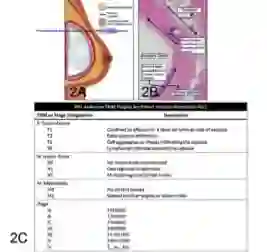 采用Lugano Ann Arbor修订分期,几乎所有BIA-ALCL均为早期,1E(83%-84%)、IIE(10%-16%),NCCN推荐BIA-ALCL TNM分期系统,大部分患者为局限性疾病,单纯手术即可治愈(图2C)。I期淋巴瘤存在于渗液中或穿入假体包膜但未超越包膜。IIA疾病局限于乳腺,但侵犯入包膜周边组织,IIB累及单一区域淋巴结。超过同侧乳腺和区域淋巴结的疾病均为IV期,转移至肝脏、小肠或骨的疾病也有报道。目前共有16例疾病相关死亡,多是疾病侵入胸壁和纵隔。