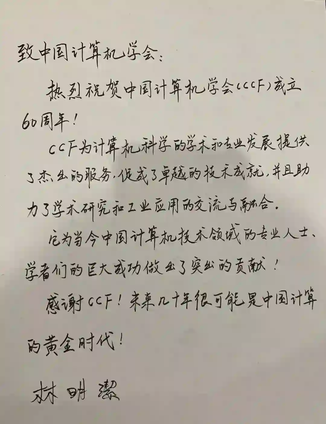 2022年正值CCF创建60周年,我们将陆续分享收到的贺信和贺电,共同祝福CCF60岁华诞!