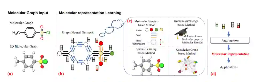 机器学习和化学科学之间的相互作用受到了这两个领域研究人员的极大关注。它在包括分子性质预测在内的各种化学应用中取得了显著的进展[Guo et al., 2020; Sun et al., 2021; Yang et al., 2021b; Liu et al., 2022b],反应预测[Jin等人,2017;Do等人,2019],分子图生成[Jin et al., 2018a; Jin et al., 2020b]以及药物-药物相互作用预测[Lin等人,2020]。分子表示学习(MRL)是弥补这两个领域差距的重要步骤。MRL的目标是利用深度学习模型将输入的分子编码为数值向量,保存有关分子的有用信息,并作为下游(机器学习)应用的特征向量。早期的分子表示学习方法使用一般表示学习模型来表示分子,而不需要明确地涉及领域知识。近年来,针对MRL专门设计了许多算法,这些算法可以更好地融合化学领域知识。在本文中,我们系统地回顾了这一快速发展的主题的进展,绘制了从结合分子结构的表示学习方法到同时结合领域知识的方法的路径。