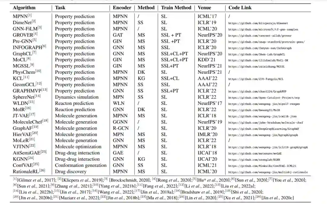 我们在表2中总结了代表性的分子表示学习算法。为方便查阅实证结果,每篇论文均附有代码链接(如有)。文中还列出了相应的任务、编码算法、方法和训练方法。这里,方法指定了我们在第3节中讨论的4种方法。对于训练方法,我们包括自我监督学习、监督学习、训练前学习和对比学习。除了算法,我们还在表3中总结了不同化学任务常用的数据集。