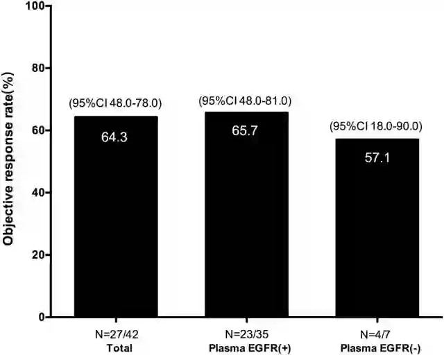 此外,研究团队还追踪了42例组织EGFR检测阳性、肿瘤可评估且接受了EGFR-TKIs一线治疗的入组患者的疗效观察。结果显示,27例(64.3%)达到部分缓解(PR),14例(33.3%)为疾病稳定(SD),1例(2.4%)为疾病进展(PD);客观响应率(ORR)和疾病控制率(DCR)分别为64.3%和97.6%。其中血浆EGFR检测阳性且接受EGFR-TKIs一线治疗的35例入组患者中,PR 23例(65.7%),SD 11例(31.4%),PD 1例(2.9%);ORR和DCR分别为65.7%和97.1%,与组织阳性人群结果十分相似。