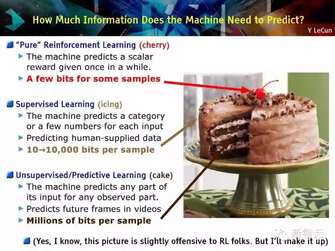 LeCun曾打过一个比方:「人类与动物的学习大都是无监督学习。所以说如果智能是一块蛋糕,那么无监督学习才是蛋糕本体,监督学习则是那层糖霜,强化学习不过是蛋糕上的一颗樱桃。」