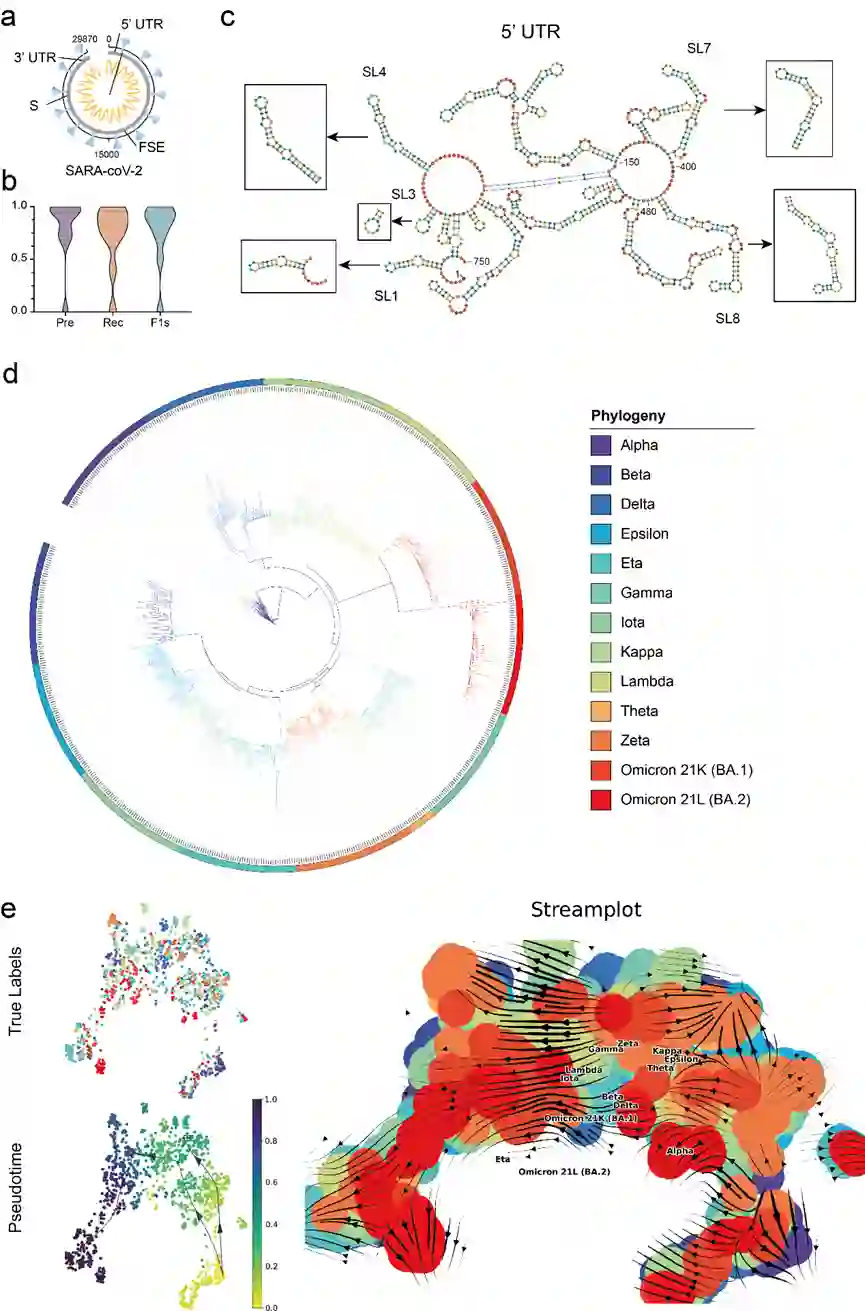 ,包括利用 RNA-FM 精准预测 COVID-19 参照基因组(29870 nt)中关键调控元件,以及利用 RNA-FM embedding 粗略预测 COVID-19 主要变种的演化趋势。