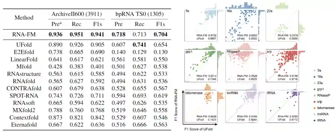 尤其是在二级结构预测上,文章以 RNA-FM 作为主干,仅以一个简单的 ResNet 网络作为下游模型,就在两个公开数据集上超过了其他 12 种 state-of-the-art 方法,在 F1score 上优于其中最好的 UFold 达 3-5 百分点,在与 UFold 的 head-to-head 比较中,RNA-FM 在绝大部分的 RNA 类别上都超过 UFold。如果将 RNA-FM 和 E2Efold 结合,还可以进一步带来 5% 的表现提升。