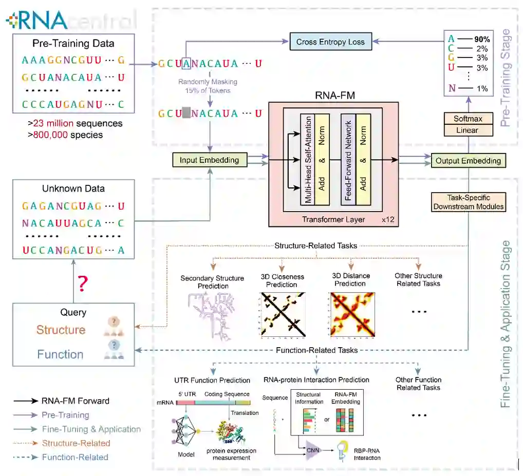提出了一个以无监督方式在 23million 的无标签纯 RNA 序列上训练的基石模型RNA foundation model (RNA-FM)。虽然数据在训练过程中没有提供标注信息,但是 RNA-FM 仍以无监督的方式挖掘出了这些 RNA 序列蕴含着的进化和结构模式。