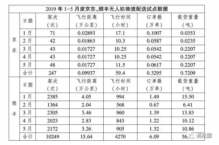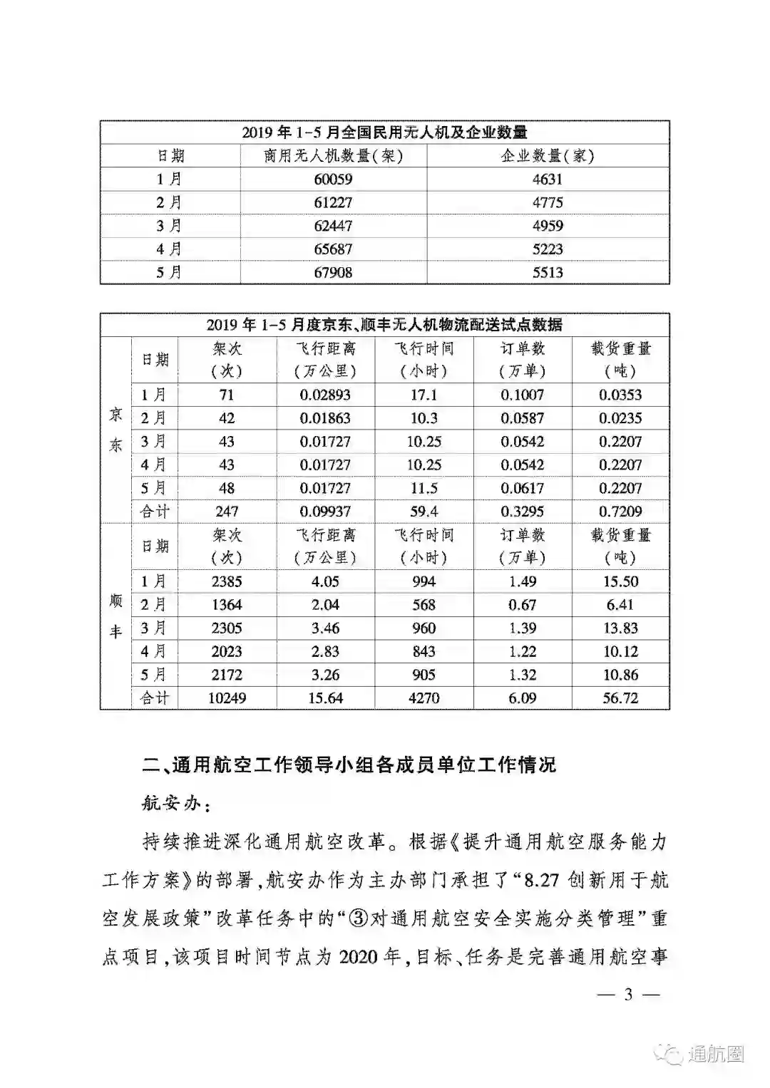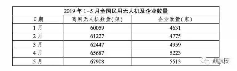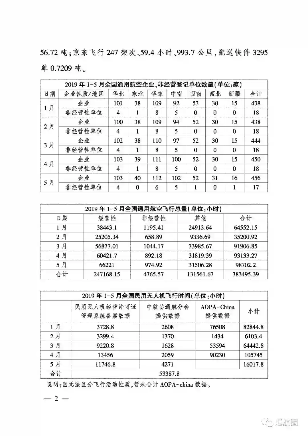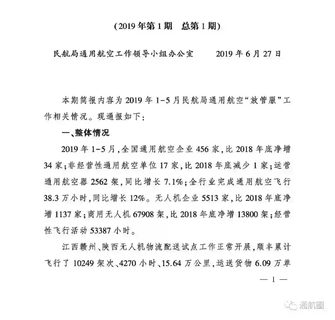 近日,民航局运输司印发了《民航局通用航空“放管服”工作简报(2019年第1期)》,对2019年1-5月民航局通用航空“放管服”工作情况进行了通报。其中,2019年1-5月,全国通用航空企业456家,比2018年底净增34家;非经营性通用航空单位17家,比2018年底减少1家,运营通用航空器2562架,同比增长7.1%;全行业完成通用航空的飞行38.3万小时,同比增长12%。无人机企业5513家,比2018年底净增1137家;商用无人机67908架,比2018年底净增13800架;经营性飞行活动53387小时。江西赣州、陕西无人机物流配送试点工作正常开展,顺丰累计飞行了10249架次、4270小时、15.64万公里,运送货物6.09万单56.72吨;京东飞行247架次、59.4小时、993.7公里,配送快件3295单0.7209吨。