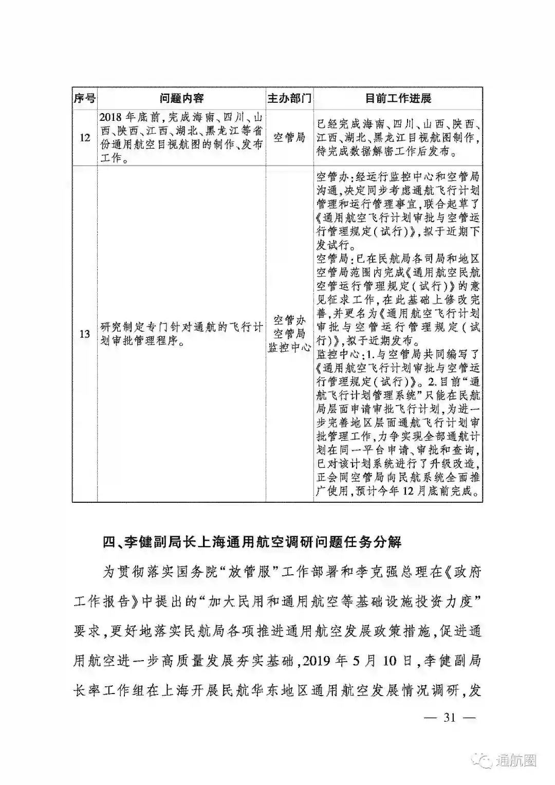 此外,简报还详细介绍了通用航空工作领 导小组各成员单位工作情况、13项由综合司移交运输司的重点督办事项进展情况、李健副局长上海通用航空调研问题任务分解,更多简报内容请见以下全文:
