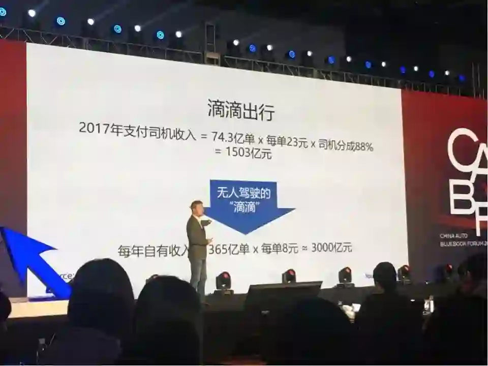 如果说通过无人驾驶来去实现,每单变成8元,比地铁贵那么一丢丢,这样促使一天能够达到1亿单,1亿单并不是特别了不起,大家知道中国一天有车出行是11亿次,1亿单就是10%左右,这样365亿单×8%,又不用跟司机分成,收入应该是3000亿元,而不是说给司机1500亿元,自己还要亏100亿元。