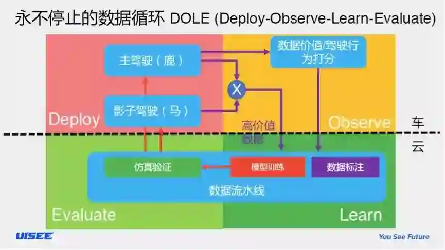 针对这两个策略,我们做了一套系统,这套系统是可以跟主机厂深度合作的平台,我们把它叫做永不停歇的数据循环,这个焦点不是在车上,是在数据上。把各个步骤分拆叫“DOLE”,我把它叫做“到来”。大家看这个虚线上面是车,下面是云。