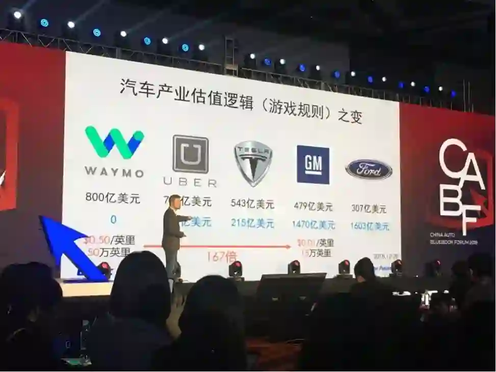 通用汽车每卖一辆车净利润1500美元,如果这辆车在生命周期里面跑了15万英里,1500美元÷15万英里,1英里赚1美分,但是Waymo用无人驾驶去实现共享出行,1英里赚0.5美元,而且这个车不知疲倦,一天到晚跑,生命周期里面跑了50万英里。所以商业模式上,通用的车跑15万英里,1英里赚1美分,Waymo的车跑50万英里,1英里赚0.5美元,它们的差别是167倍。