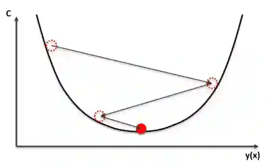本质上,我们可以如此看待小球的行为:小球从左到右优化它的位置,最终到达谷底,在本例中,底部就是误差函数的最小值。这就是梯度下降算法在做的事情,它从一个位置开始,计算成本函数C的导数和二阶导数得到关于“小球”朝哪滚的信息。每次我们计算导数时,我们都可以得到当前位置山谷边坡的斜率信息,这在下图中用蓝线表示。