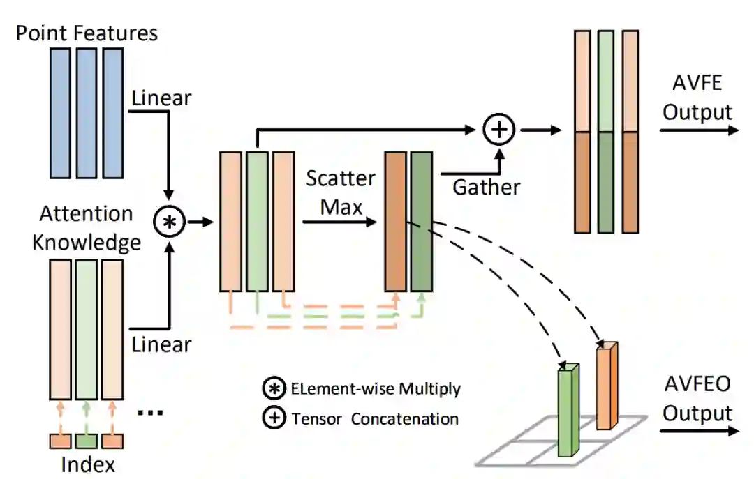 图 6 AVFE和AVFEO层。索引张量用于索引操作:聚集(Gather)和分散(Scatter)