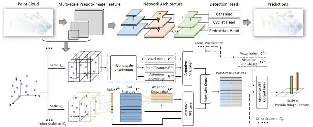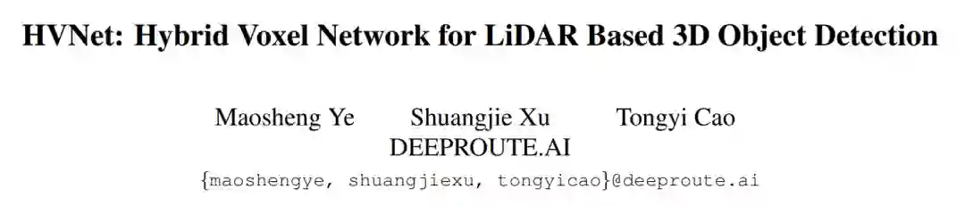 在这项工作中,我们提出了一种新型的单级三维目标探测网络HVNet。HVNet将混合尺度体素聚合成统一的逐点特征,然后在注意力特征的引导下将其投影成不同尺度的伪图像特征。HVNet的关键是对特征提取尺度和伪图像投影尺度进行解耦。此外,特征融合金字塔网络的主干获取伪图像并融合特征,以生成不同类别的紧凑表达。实验研究表明,该方法取得了目前最先进的效果,并且具有较高的实时性。