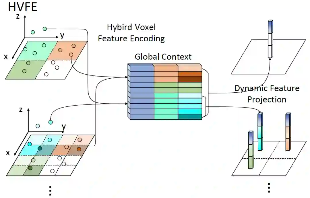 为了应对上面问题带来的挑战,我们通过多尺度的点云信息,利用注意力机制(attention),提取更加细粒度的点云特征,然后映射到更大格网粒度上,从而保证速度跟精度的平衡。传统体素特征提取网络(VFE)方法通常包含三个步骤:1.体素化:将点云指定给二维体素网格。2.体素特征提取:为每个点计算依赖于网格的逐点特征,并将其送入PointNet风格的特征编码器。3.投影:将逐点特征聚合到体素级特征,并投影回其原始网格,形成伪图像特征图。HVNet中提出的HVFE方法则将混合比例尺度下的点级别的特征聚合到全局上下文中,然后投影到动态目标尺度中的特征图上。