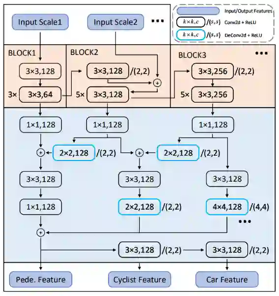 2. 2D 卷积部分,我们利用HVFE layer提出的多尺度的feature map,在特征图上面也进行多尺度的融合。由于点云的稀疏性和伪特征图的低分辨率性,我们提出了尺度融合金字塔网络(FFPN)来进行进一步的特征融合。多尺度特征首先在主干网络中浅层融合,然后在提出的FFPN网络中进行深度融合。