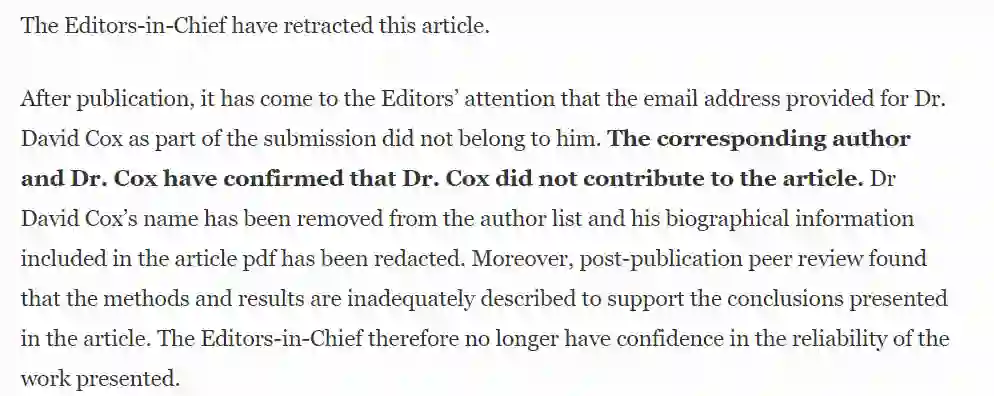 Springer Nature 发布的撤回声明。该声明表示,论文的通讯作者已经证实,Cox 对论文没有贡献。同时,新一轮的同行评审发现,两篇论文提出的方法和结果描述不足以支撑论文的结论,因此,期刊主编对该论文的可靠性不再抱有信心。
