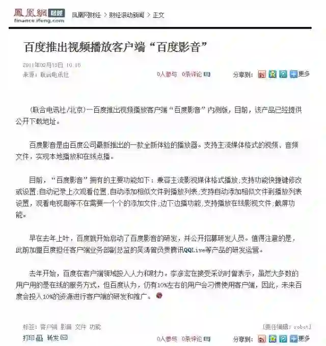 特别是QVOD快播,不仅是百度工具栏的主要安装来源,更是360安全卫士的主要安装来源。为了让用户新增渠道安全度提升,也为了有效打击对手,果断申请要做“百度影音”这个产品。PC-core也非常支持,当时还专门在Robin大会议室开了一个汇报会,各位e-staff成员一致通过要马上开始。